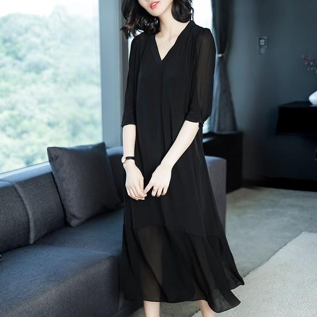 秋装中长款黑色宽松显瘦长裙,简约大方,充满视觉感,优雅的圆领,衬托女性的锁骨美,凉爽轻柔的面料触感。