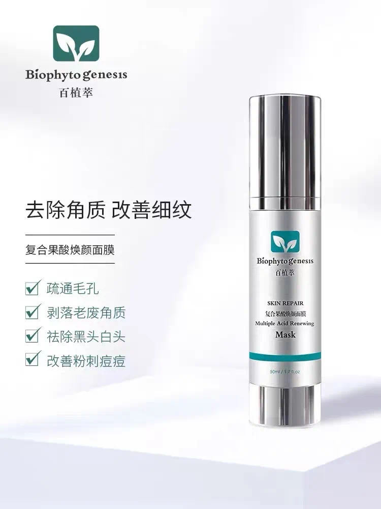 以百植萃的复合果酸焕颜面膜为例,其四酸复配功效优于单一果酸,除了添加具有收缩毛孔和祛痘效果的水杨酸成分,还复合添加了羟基乙酸,扁桃酸和壬二酸,改善使用者粉刺、痘痘的同时,赋予其清爽控油、细嫩亮肤的功效。
